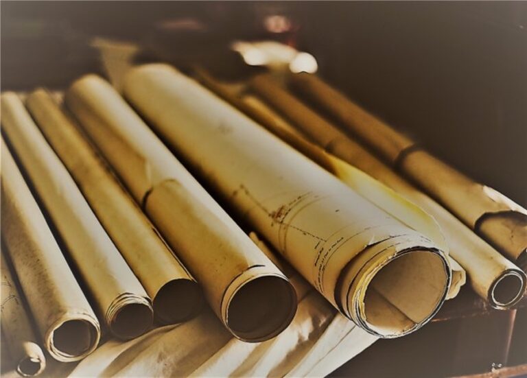Les plans Accroché sur le mur de l’Atelier de Saint Joseph, un plan dessiné sur un parchemin aux coins écornés.